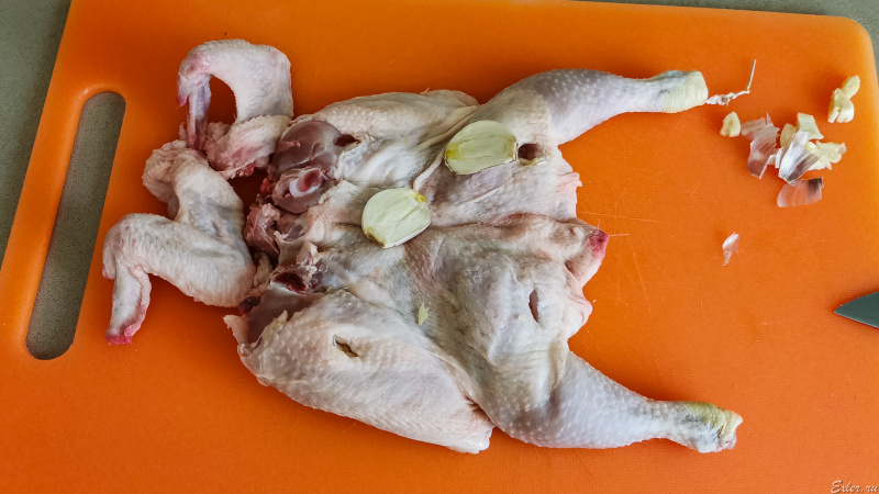 Теперь важный момент. Берем дольку чеснока, чистим и нарезаем ее на несколько небольших кусочков. В мясистых частях тушки ножом проковыриваем дырочки, туда засовываем кусочки чеснока, чтобы они в отверстии скрылись целиком. На такого цыпленка я делаю 4-6 отверстий. Далее берется еще одна долька чеснока, чистится, режется вертикально пополам, после чего этими двумя половинками тушка натирается. Чеснок - важная составляющая этого блюда, он очень сильно влияет на вкус самым что ни на есть положительным образом!