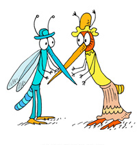 3) Два комара-гея сильно влюбились друг в друга. Один комар сел на колени и попросил у своего партнера ногу. Партнер был эйфорически рад и станцевал танец счастья. На следующий день они вместе полетели в Лас-Вегас. Большую часть своего времени в Лас-Вегасе они провели в казино, играя в мафиози. Дико устав, прыгая, ушли они из казино. На темной страшной улице из угла на них выпрыгнула злая пчела-гангстер. Пчела нахамила и показала свое острое жало. Оба комара от испуга забились в судорогах. Пчела прыгнула на комаров и схватила деньги, которые они выиграли. Довольная пчела медленным мужским шагом ушла. Комары были в шоке и стали плакать из-за своих денег. Их большую катастрофу видел бездомный муравей, который брел мимо. Муравей пошел утешить плачущих комаров. Комары драматично стали рассказывать ему, что у них нет денег, чтобы сыграть свадьбу. Готовый помочь муравей сказал, что он проводит венчания и предложил им свои услуги. Комары взяли муравья за руки и станцевали с ним энергичный круговой танец".