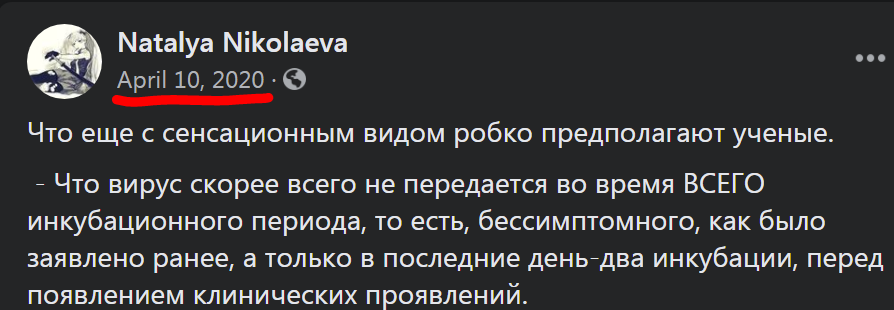 Бо мне сейчас люди приносят ссылки, где какие-то профессора медицины называют "сенсацонным открытием" исследование немецкого ученого Хендрика Штрека, который доказал, что образцы вируса, взятого в помещениях, где находились больные, то есть в их квартирах в момент болезни, не способны не то что заражать, а и культивировать их не удалось. И говорят мне: "Вот, ваше мнение подтверждается". Это не мое мнение. Это в учебниках старых так написано: Не живет вирус респираторных инфекций во внешней среде - ни на поверхностях, ни в земле, ни на упаковке товаров.