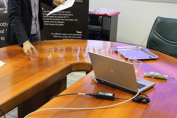 С нами на заводе Philips Saeco провели целый семинар по сенсорному анализу, в котором мы выступали как тестеры-потребители. Выглядело это следующим образом.