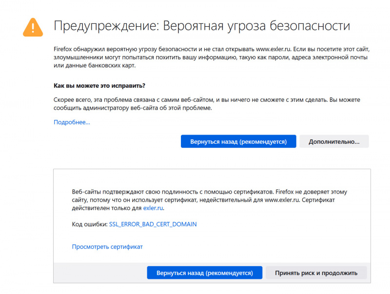 Мы меняем сертификат домена exler.ru из-за проблем с Namecheap, браузер может какое-то время ругаться - разбираемся.