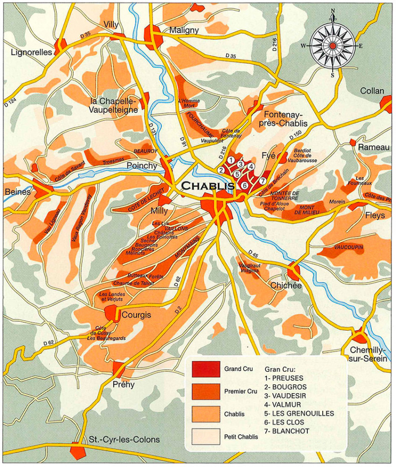 Вот карта всех виноградников Шабли и список всех клима (исторически выделенных участков) Grand Cru, потому что Grand Cru - это формально один участок (его хорошо видно на карте, там отмечены все семь клима). Premier Cru в Шабли официально сорок, но основных из них - семнадцать.