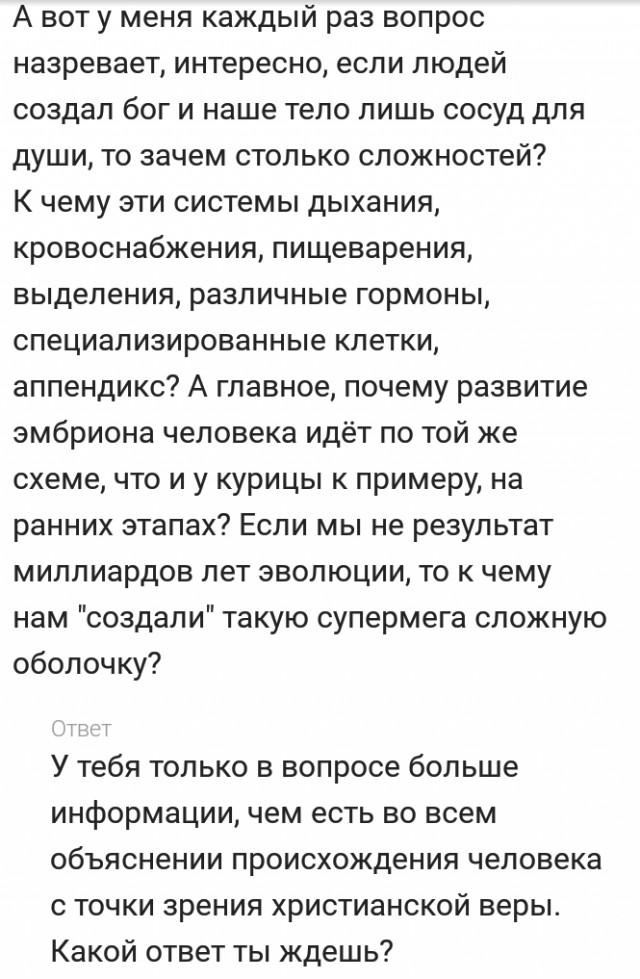 Причем от сторонников эволюции требуют объяснить массу мелких деталей, типа коленвала, а в ответ предлагают допустить, что он получился актом творения именно таким уже без деталей - зачем и почему.