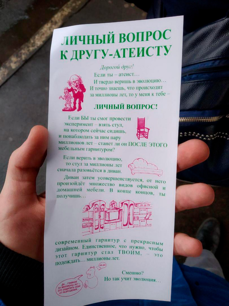На самый главный вопрос не ответили: зачем вообще стулу эволюционировать? Единственные реальные враги стула - время и кислород. Чтобы выжить, стулу нужно сразу сделать из неразлагающегося материала, что есть по сути божественное творение. Так что они приводят пример из своей картины мира, а не из атеистической