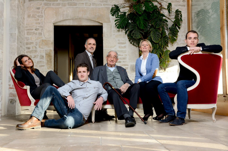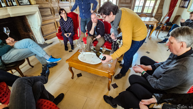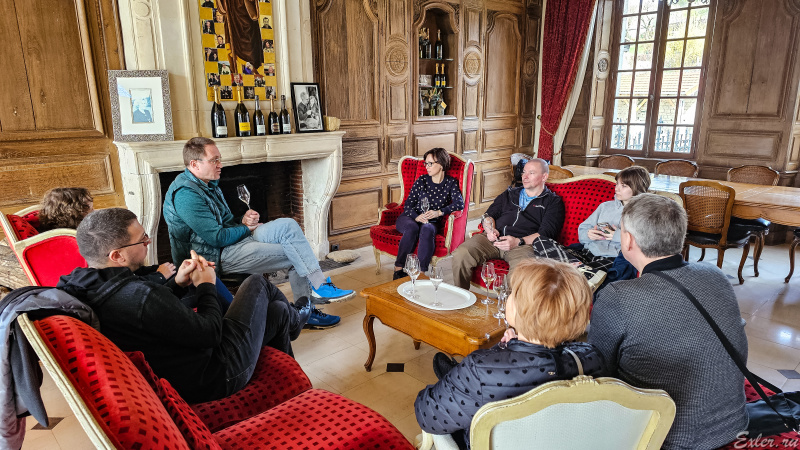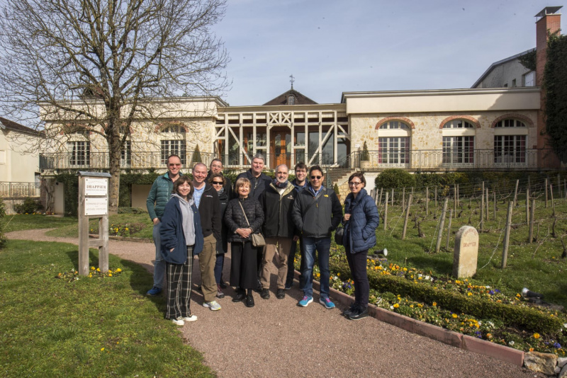 Андре руководил домом "Драпье" вплоть до 90-летнего возраста, а сейчас им руководит представитель седьмого поколения семьи - Мишель Драпье, и именно он нас приветствовал лично, когда мы приехали на дегустацию: вот наша группа, Мишель находится в центре.