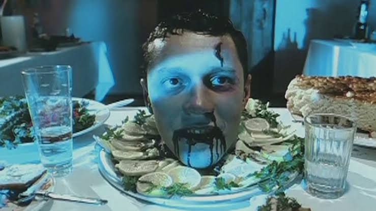 Варакин отправляется обедать и в качестве «комплимента от шеф-повара» получает торт в форме головы. Отказ отведать торт влечет самоубийство повара. «Город Зеро», 1988 г.
