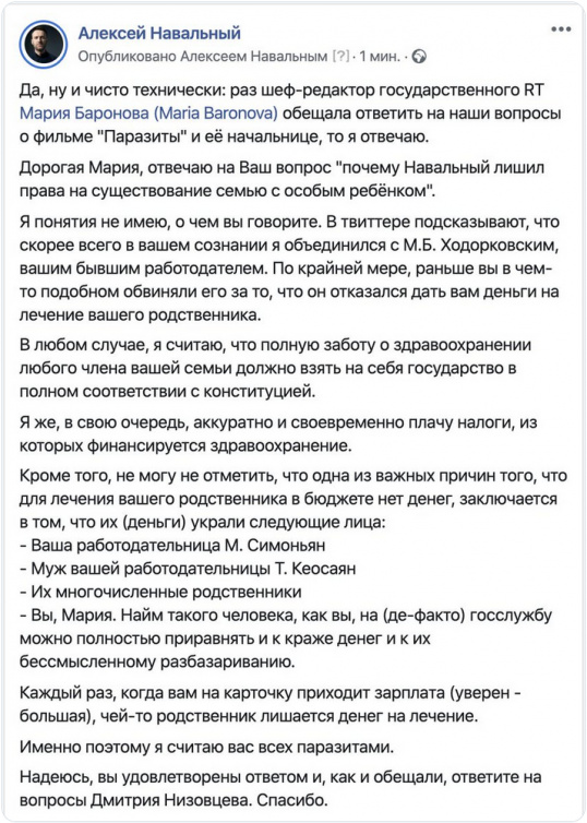 Навальный ей уже ответил. Теперь ход Бароновой.