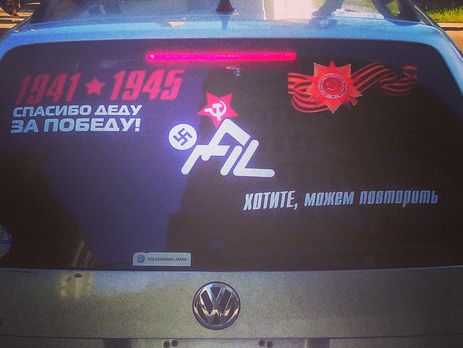 На багажнике сверху - "Спасибо деду за Победу", а внизу - "Дойче моторс".