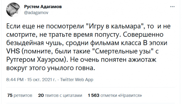 Адагамов в своем Твиттере по поводу "Игры в кальмара". Мне особенно про "безыдейную чушь" понравилось. Не смотрите, не тратьте время попусту на ажиотаж вокруг этого унылого говна.