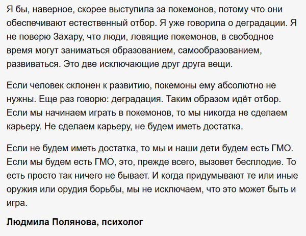— Из нас делают нацию обслуги, которая не получает высшее образование, но бегает за покемонами.(Полянова)