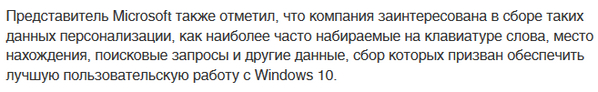 Есть сбор информации, необходимой для персонализации. Речь идет о персонализации Cortana, подсказок экранной клавиатуры и т.д. Сбор этой информации можно отключить в настройках.