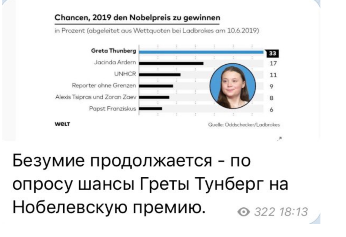 Помните шуструю шведскую девочку Грету Тунберг, которая отказалась ходить в школу по пятницам, пока политики не выполнят Парижское соглашение по климату? Ее тогда эти прекрасные люди из Нобелевского комитета немедленно номинировали на Нобелевскую премию мира. Это для них обычное дело - то Гора номинировали с его "исследованиями", то аналогичных персонажей. Стоит кому-то выкинуть какой-нибудь заведомый идиотизм "против глобального потепления" - они тут же несутся этого персонажа номинировать.