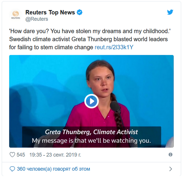 В 2018 году шведская школьница Грета Тунберг устроила забастовку возле здания парламента в Стокгольме, заявив, что отказывается ходить в школу по пятницам, пока политики не будут выполнять Парижское соглашение по климату. Акция Тунберг привлекла внимание во всем мире, и школьники из других стран тоже начали устраивать климатические забастовки. Сама Тунберг была номинирована на Нобелевскую премию мира, начала общаться с политиками и посещать международные конференции. В августе 2019 года она пересекла Атлантический океан на парусной яхте, чтобы добраться до Нью-Йорка и принять участие в саммите ООН по изменению климата. На открытии саммита 23 сентября Тунберг выступила с эмоциональной речью.  (Отсюда.)