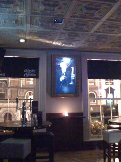 А по кабелю A.V. скорее всего идет сигнал, ну и картинки меняются, а на экран пленочка наклеена, дабы создать впечатление холста, да и блики не от картины маслом.
