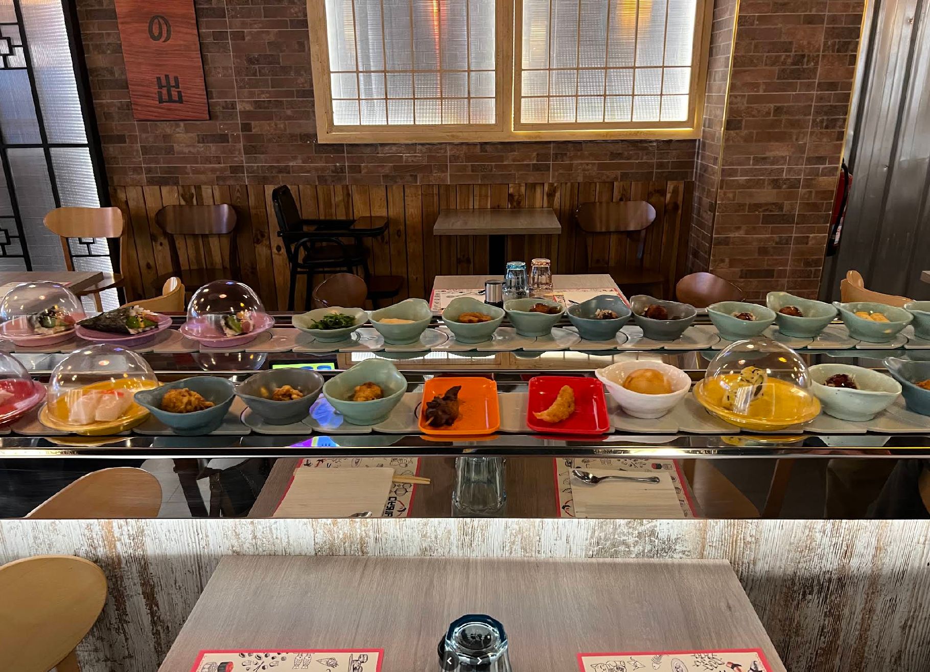 Я с таким конвейером который мимо клиентов вдоль столов по кругу крутится, впервые столкнулся в Лондоне в 2009 году. Там было несколько категорий блюд (суши) в посуде разных цветов. Каждый цвет соответствует ценовой категории. На выходе рассчитывают по количеству и цветам посуды.