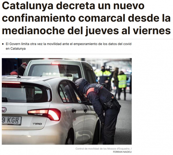 После того как испанские чиновники издали совершенно гениальный указ, требующий на пляже постоянно находиться в наморднике, они обессиленно затихли на пару недель (хотя вроде обещали выступить с разъяснением по поводу того, нужно ли и купаться в наморднике, или для купания может быть сделано исключение). Но тут проснулись каталонские чиновники, которым стало обидно, что они не могут издать какое-нибудь очередное идиотское постановление. Издали - "Catalunya decreta un nuevo confinamiento comarcal desde la medianoche del jueves al viernes". Опять всех позапирали по своим районам (комаркам) без права выезда без уважительной причины. Нарушил - штраф.