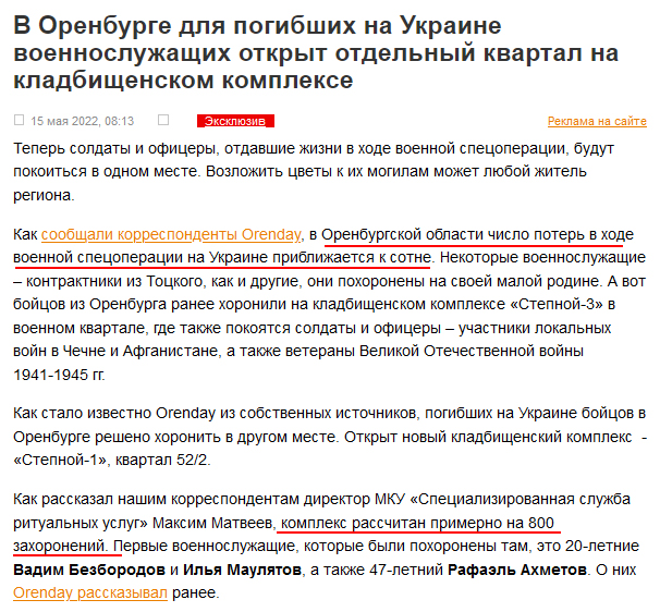 Хорошие новости в Оренбурге открыли новый квартал на кладбище где будут хоронить погибших в Украине российских военных. Комплекс расчитан примерно на 800 захоронений