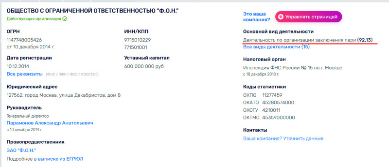 Посмотрите выписку из ЕГРЮЛ этой конторы. Там на самом деле много направлений деятельности, пари - лишь первый пункт из списка. На самом деле интерес представляют учредители (65% - кипрский оффшор, 35% - небольшое кол-во физлиц)...