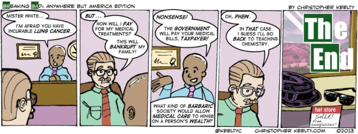 Так вот, возвращаясь к Уолтеру Уайту, у него был HMO. Когда обнаружился рак, он пошел к своему основному доктору, который сообщил, что с химиотерапией проживет пару лет. Ну и семья Уолтера решают, что надо идти к лучшему онкологу в городе, который не входит в HMO network, и соответственно кучу денег надо платить самим. Если бы попросили направление у основного врача (или поменяли основного врача на другого, входящего в группу с лучшими онкологами), то HMO покрыло бы стоимость лечения полностью.