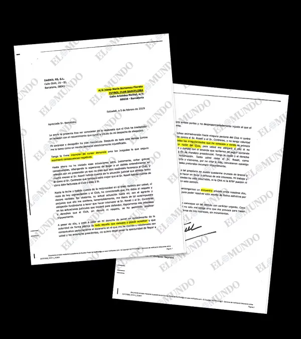 «Лично я не заявляю о враждебности ни к кому из членов Клуба, ни к вам, ни тем более к г-ну Роселлу или г-ну С, и у меня нет желания предать огласке все нарушения , которые я знал и испытал на собственном опыте в отношении кого-либо из Клуба, но вы заставите меня сделать это, если вы не пересмотрите свое решение и не выполните соглашение, которое мы должны были продолжать рассчитывать на мои услуги до конца президентский срок. Я прав и имею право защищать указанное требование. И вы, и г-н Роселл, как вице-президент и президент, и наоборот, не говоря уже о большем, согласовали со мной договоренности, которые сегодня вы намерены безнаказанно нарушать».