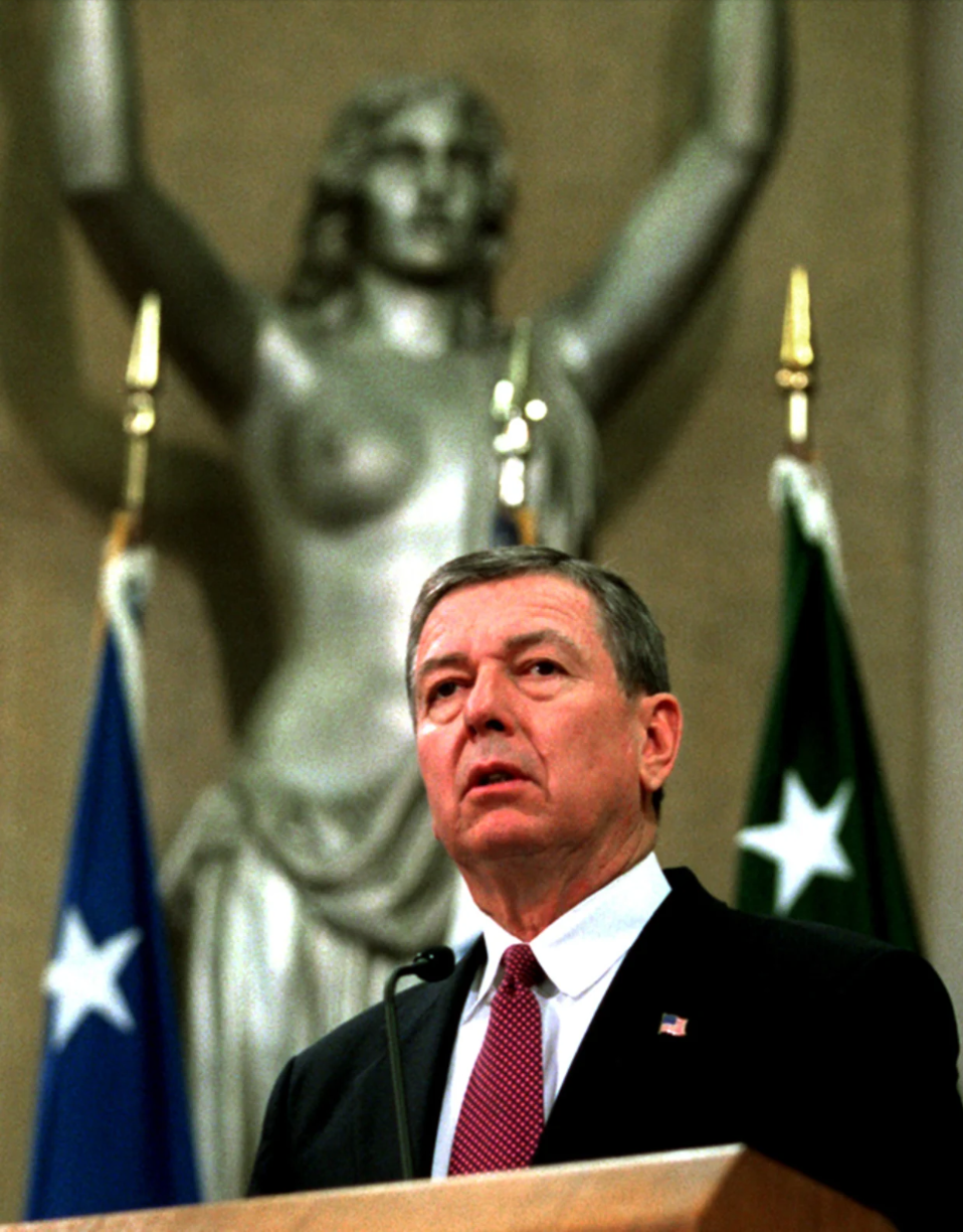 20 лет назад Бушевский назначенец, Генеральный Прокурор Джон Эшкрофт велел статую Фемиды, установленную в Министерстве юстиции спрятать за синюю занавеску.