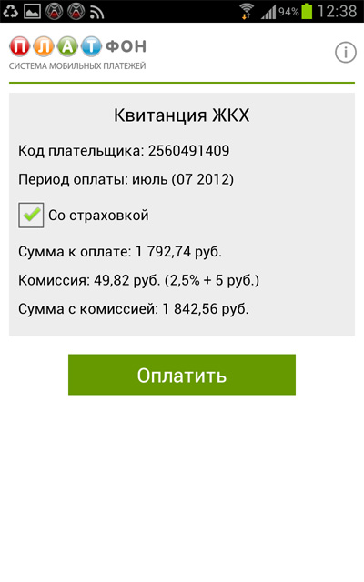 Запускаем приложение, нажимаем "Сканировать" - штрих-код надо поместить в прямоугольник сканера. Проверка подлинности квитанции происходит автоматически - в случае, если реквизиты квитанции ЕИРЦ не соответствуют реквизитам за услуги ЖКХ, то программа откажет в оплате такой квитанции.