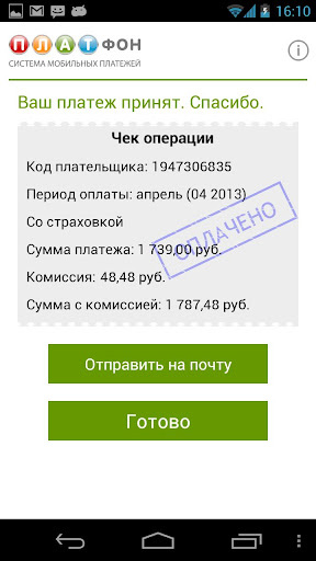 Ну и все, оплачено. Приходит вот такая квитанция, которую вполне принимают в ЕИРЦ, если возникают какие-то вопросы по оплате. Эту же квитанцию можно отправить себе на электронную почту, причем данные платежа еще и сохраняются для повторной оплаты (мало ли, может, понадобится вперед что-то оплатить).