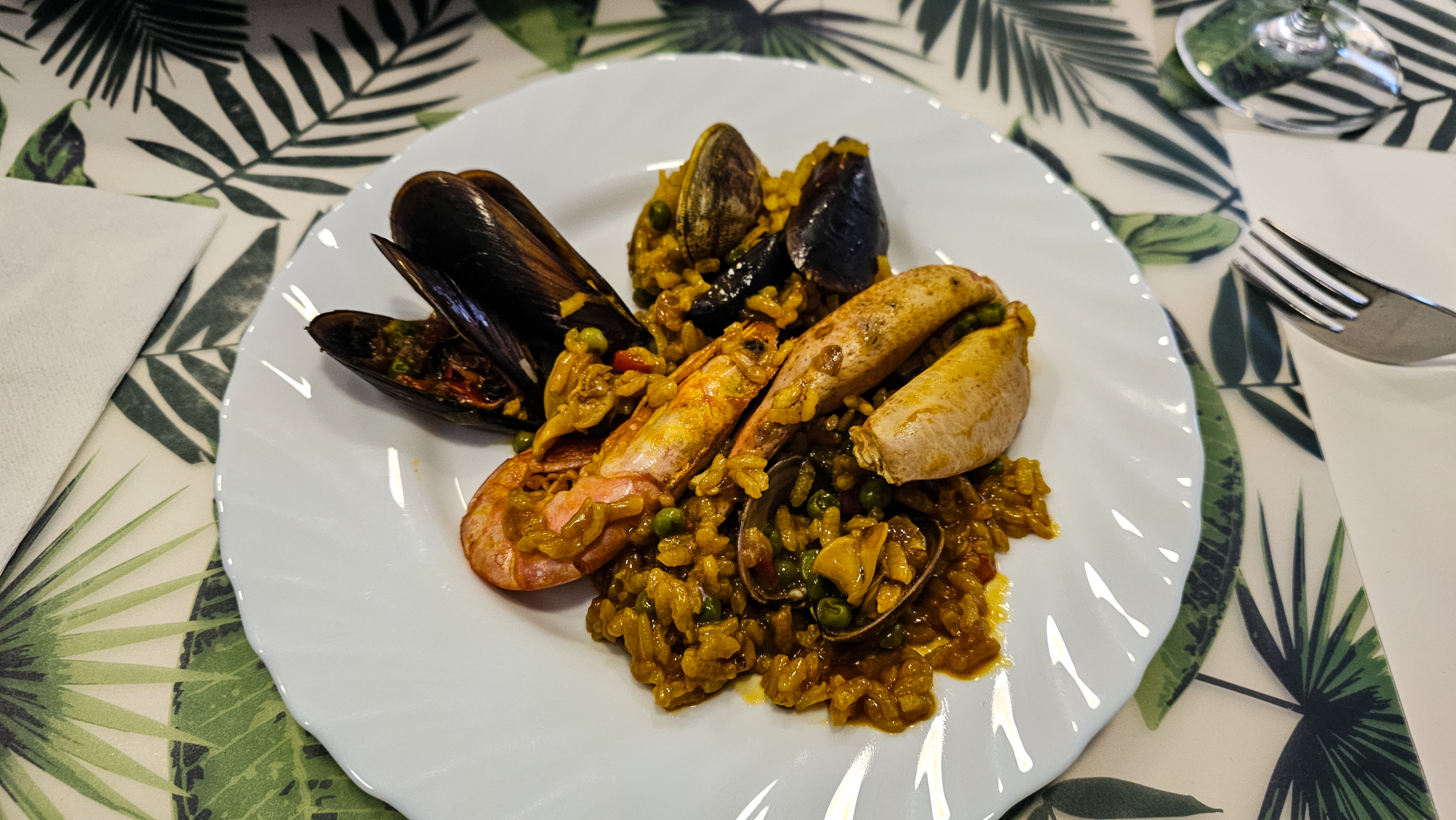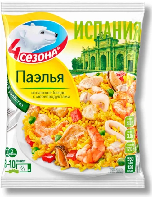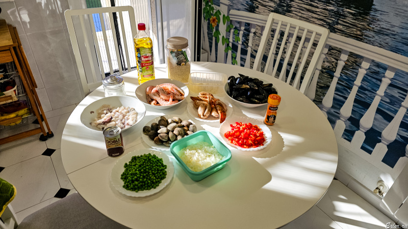 Дано: маленькие кальмары, мидии, ракушки, клешни крабов, креветки, лук, чеснок, молодой горошек (размороженный), красный сладкий перец, круглый рис "бомба", приправы для паэльи, оливковое масло, рыбный бульон (концентрат), томатная паста. Задача - сконструировать paella marinera.