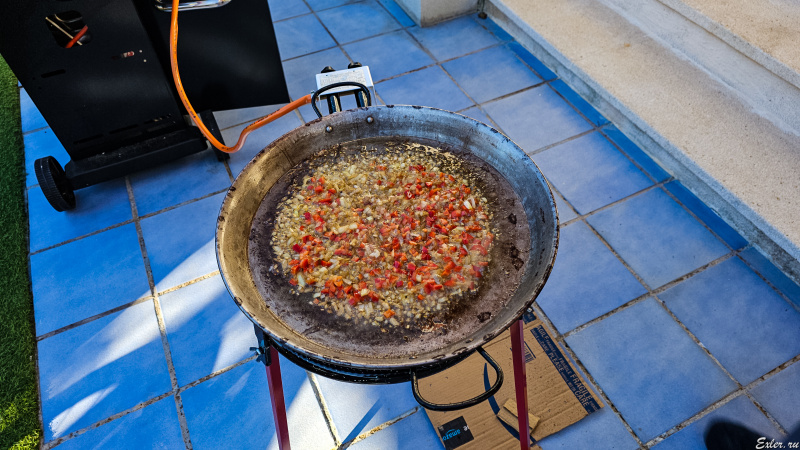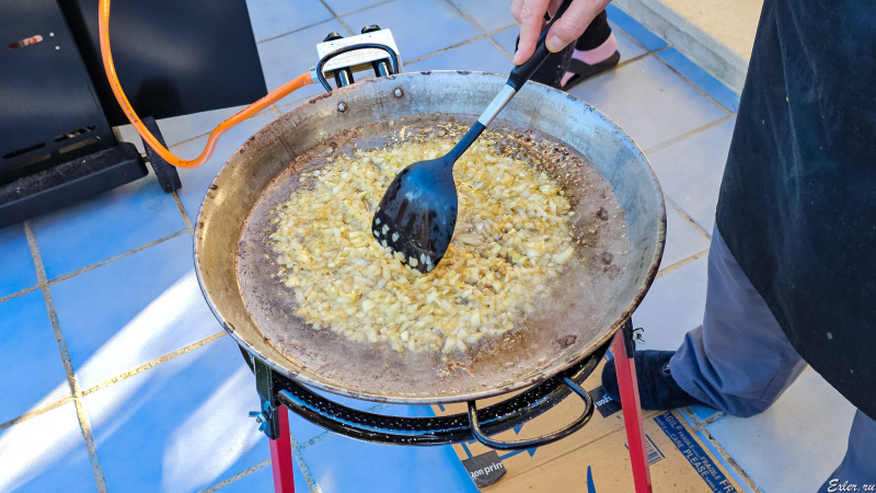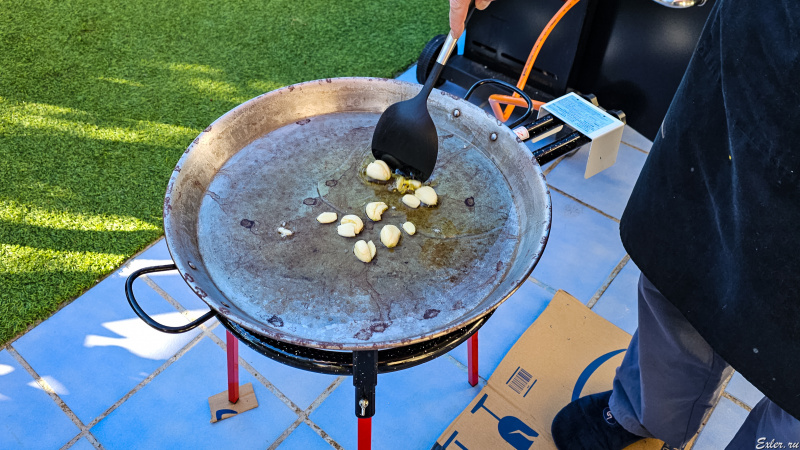 Ставим газовую горелку (у нее два контура нагрева), включаем внутренний контур, наливаем оливковое масло так, чтобы оно покрыло все дно паэльеры, обжариваем в масле раздавленный чеснок.