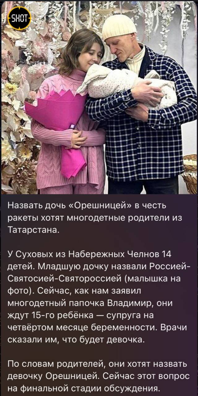 Также многодетный отец не исключил и другие имена для своих детей - например Путник, Путница, Спутник, Спутница во имя великой и могущественной России, нашего народа и великого главнокомандующего Владимира Владимировича Путина.