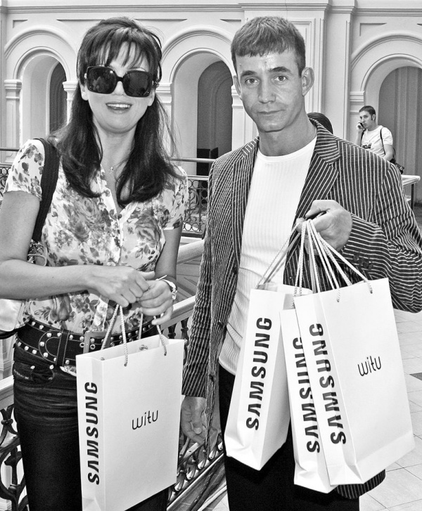 Певцов со всеми подарками и сувенирами, когда нарвался на мой фотоаппарат, бежал к своему автомобилю, чтобы загрузить заслуженную добычу! Я потом наблюдал, как супруга Ольга оставалась на шухере у одной из колонн универмага до возвращения мужа, где стояли еще четыре пакета с телефонами... Певцов, радостно цокая копытами, быстро совершил и вторую ходку к багажнику своего автомобиля...