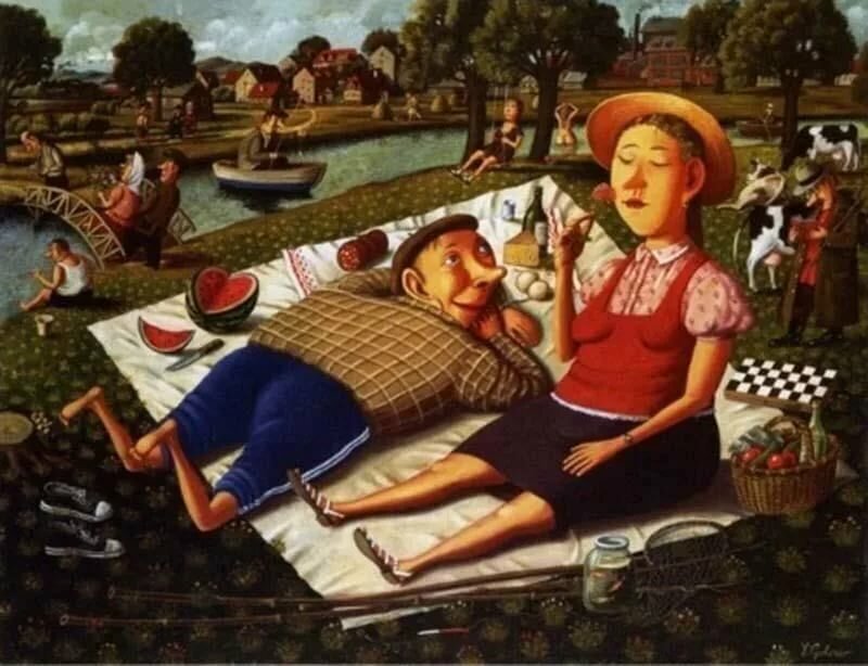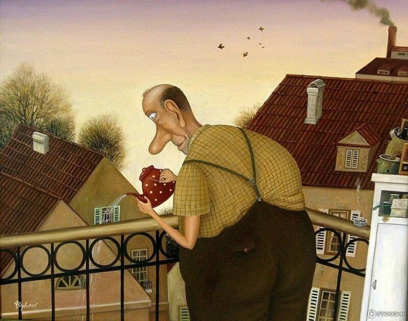 Мне его картины очень нравятся, есть в них какое-то очарование (публикуются отсюда). Самая последняя картина получила отдельный приз зрительских симпатий кота Бублика.