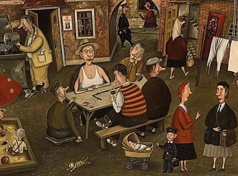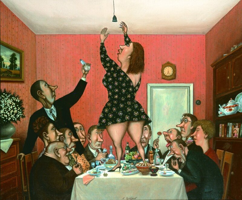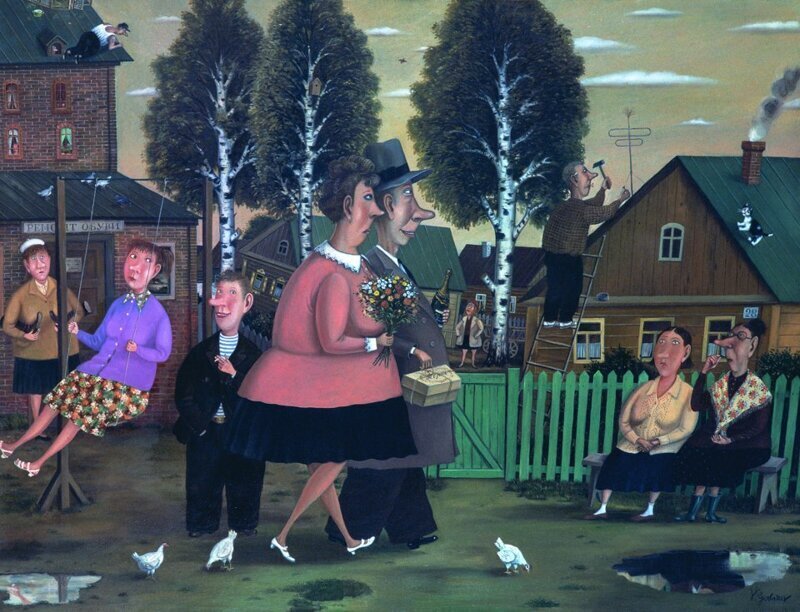 Стиль Валентина Губарева - наивный соцарт: будни людей в провинциальных городах, преимущественно советских времен.