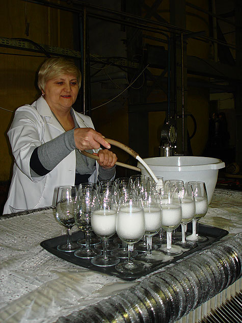 Специалисты завода знают толк в презентации. Прежде чем рассказывать о башнях — цистернах с трехэтажный дом, где идет процесс шампанизации, нам предлагают продегустировать напитки. Из пластиковой трубки под напором хлещет пенная струя.