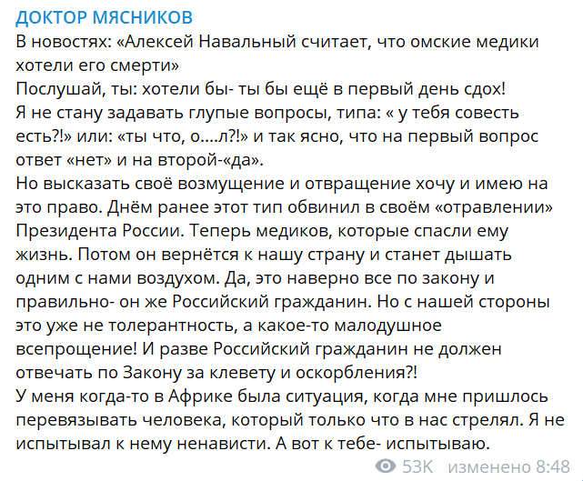 А теперь внимательно следим за реакцией известной шавки доктора Мясникова. Вот что он написал в своем телеграм-канале.