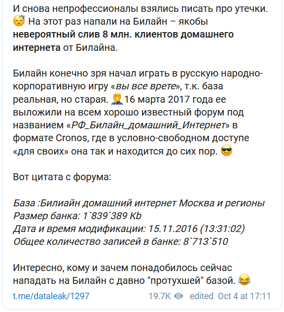 Мне без разницы, кому и зачем понадобилось сейчас нападать на "Билайн" с "давно протухшей" базой, только она ни черта не "протухшая", там абсолютно реальные данные восьми миллионов клиентов Beeline.