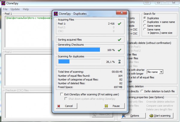 Danmag: Поставил CloneSpy. Попробовал, удалил. То же самое делает Total Commander, только быстрее - а именно ищет дубликаты по имени и размеру (еще может и по содержимому).