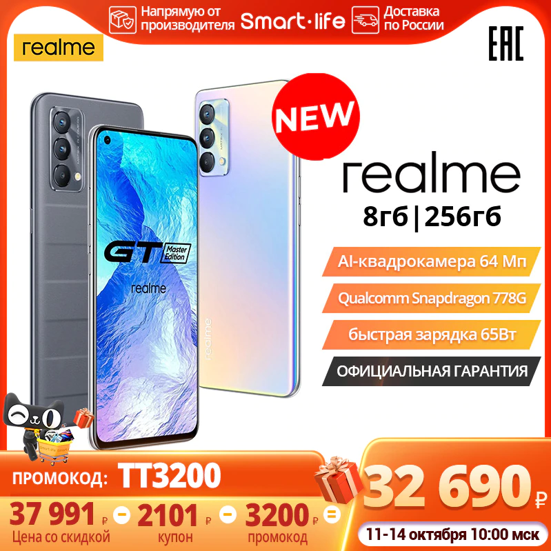 На следующей сезонной распродаже с 11 октября realme GT Master edition версия 8/256 Гб будет доступна за 32690/39990 рублей и версия 6/128 Гб за 29199/39990 рублей на Алиэкспресс (Tmall) с доставкой с российского склада.