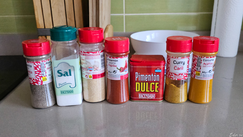 Соль, черный перец, сладкий красный перец, острый красный перец паприка, сухой чеснок, карри, куркума.