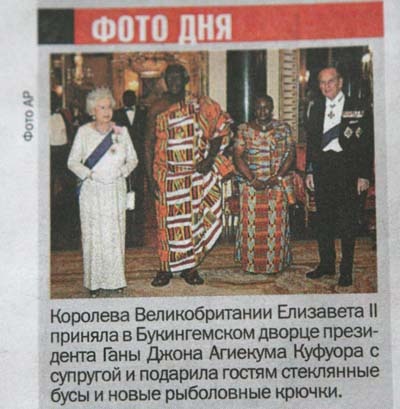 Из Лондона сообщают: королева Великобритании Елизавета II приняла в Букингемском дворце президента Ганы Джона Агиекума Куфуора с супругой Терезой и подарила гостям стеклянные бусы и новые рыболовные крючки.