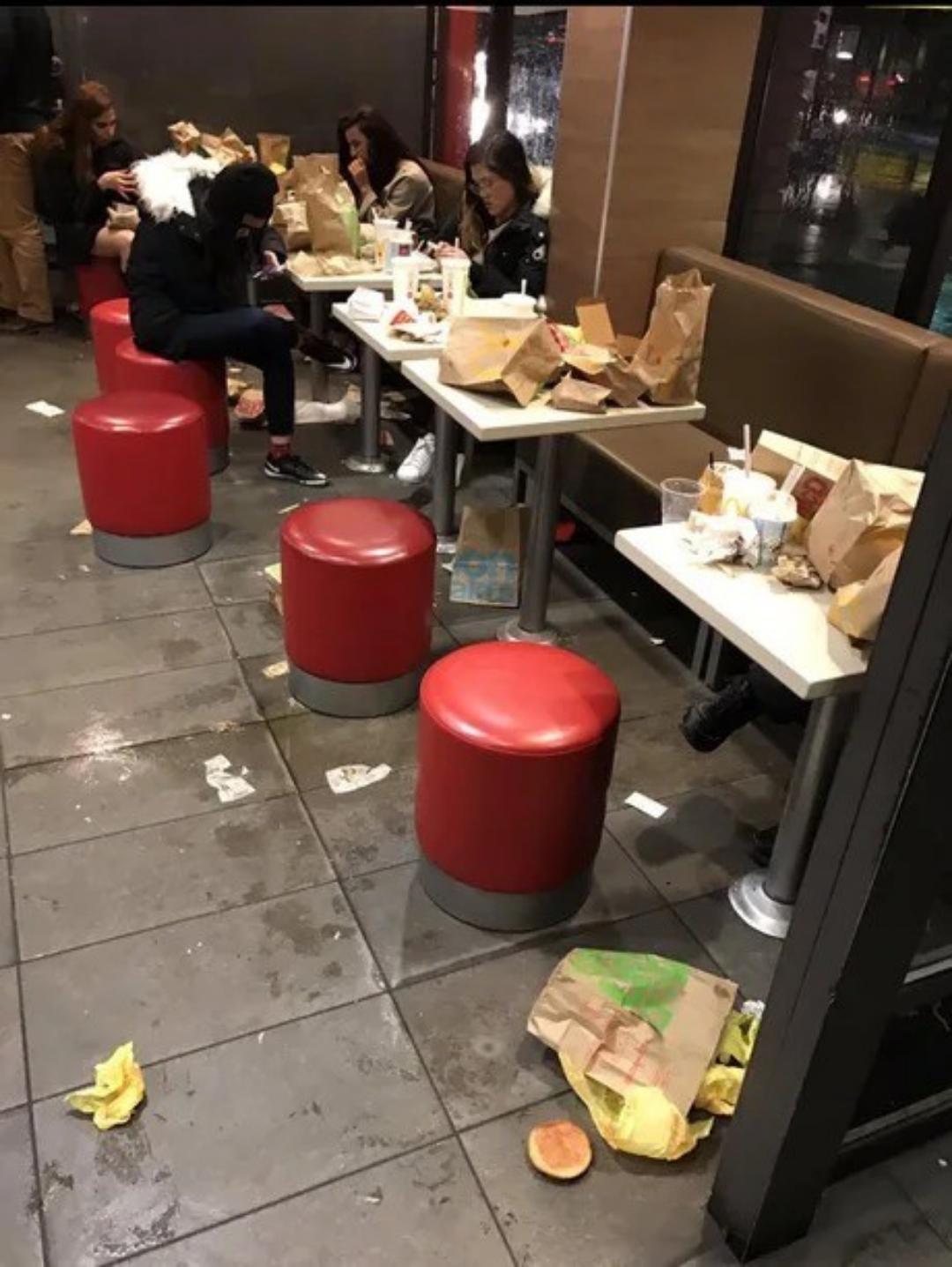 Заходят клиенты откушать, допустим стайка молодежи. Заказывают, садятся, едят. Далее - и хотели бы убрать, но некуда. Оставляют на столе. Уборщика нет, мусор лежит на столе.