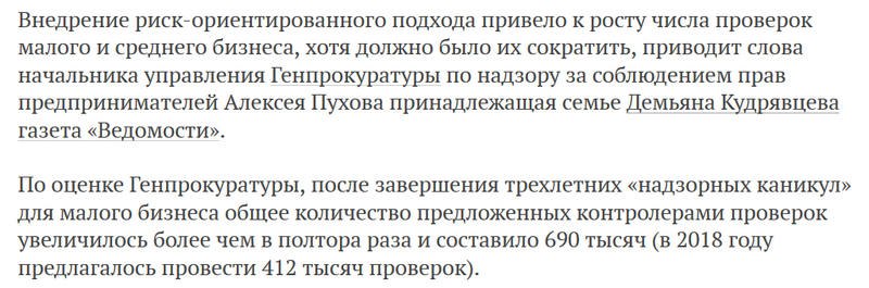 По данным Генпрокуратуры, ввиду завершения трехлетних «надзорных каникул» для малого бизнеса общее количество предложенных контролерами проверок увеличилось более чем в полтора раза и составило 690 000 проверок (в 2018 г. их предлагалось провести 412 000). (Отсюда.)