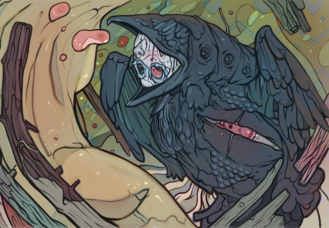 Правда, привычка присасываться к женским грудям и пить из них молоко и кровь, «пока до скелета не усохнет баба», намекает на их мертвомладенческую сущность. Также навки иногда существуют в виде ворон, которые нападают на людей с целью выклевать им глаза.
