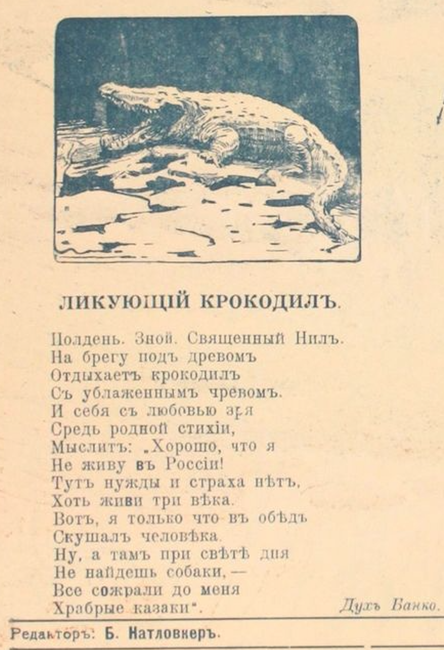 Журнал «Вампиръ», №2 за 1906 г., стр. 7. Полная версия стиха, которая несколько меняет его тональность, под спойлером. (Не очень, правда, понятно, почему казаки оказались корейцами…)