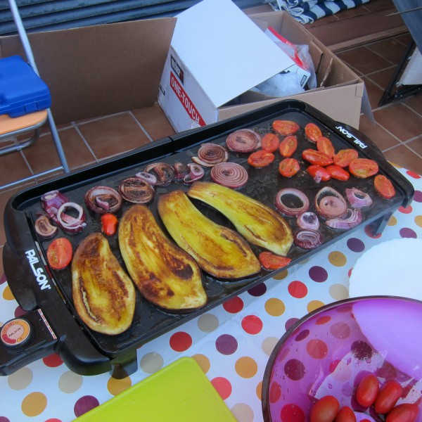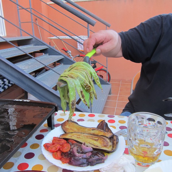 Кладутся овощи, обильно поливаются сверху оливковым маслом, в которое предварительно брошены чеснок, розмарин, перец, лаврушка. Готовится тоже где-то по пять минут на стороне на полной мощности планчи.