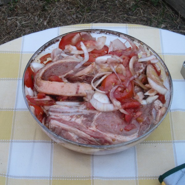 С мясом особо не мудрили: прикупили говядинки в магазине, замариновали в луке и помидорах. (Недавно услышал о таком способе - такой маринад, впрочем, обычно используют для свиного и бараньего шашлыка. И лук с помидорами лучше прокрутить через мясорубку, но у меня ее тут нет, поэтому просто порезал.)