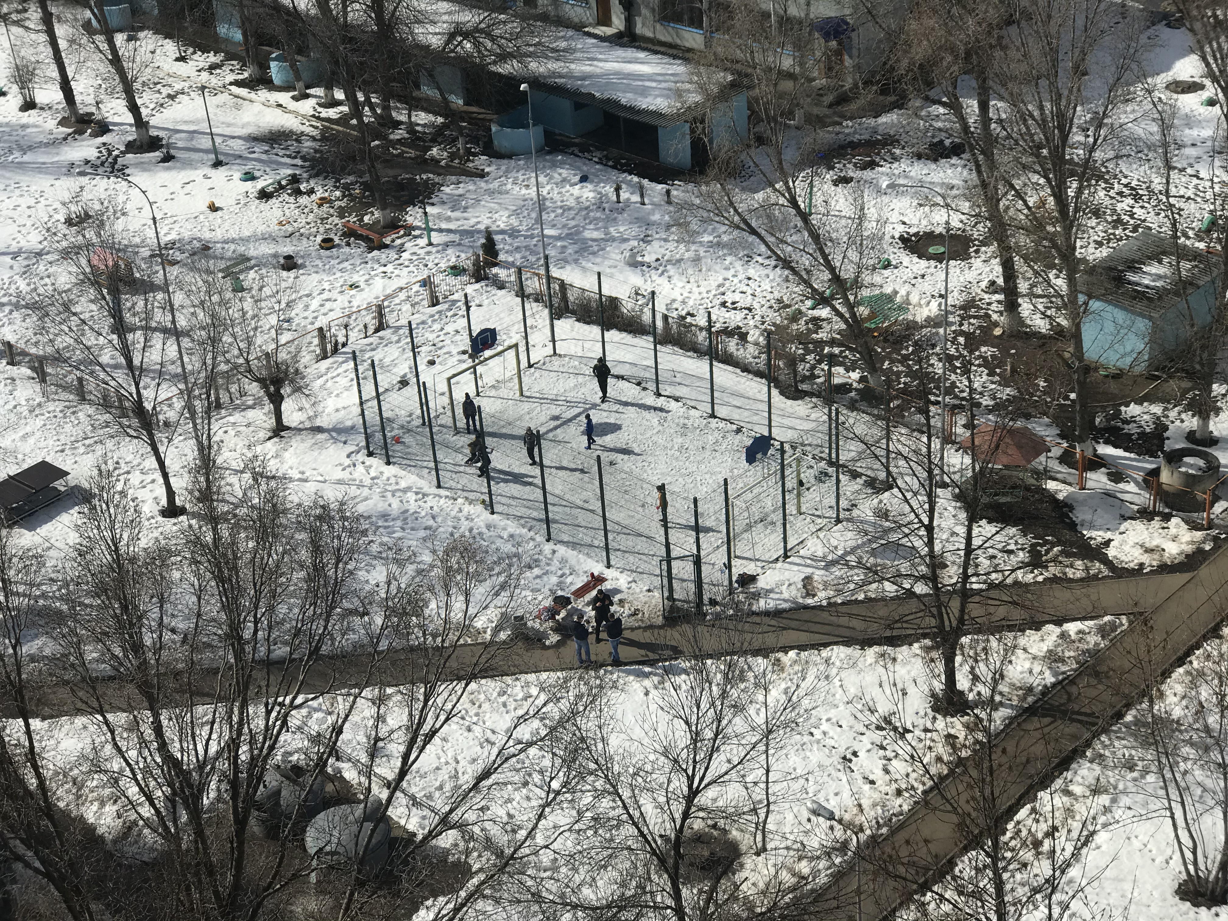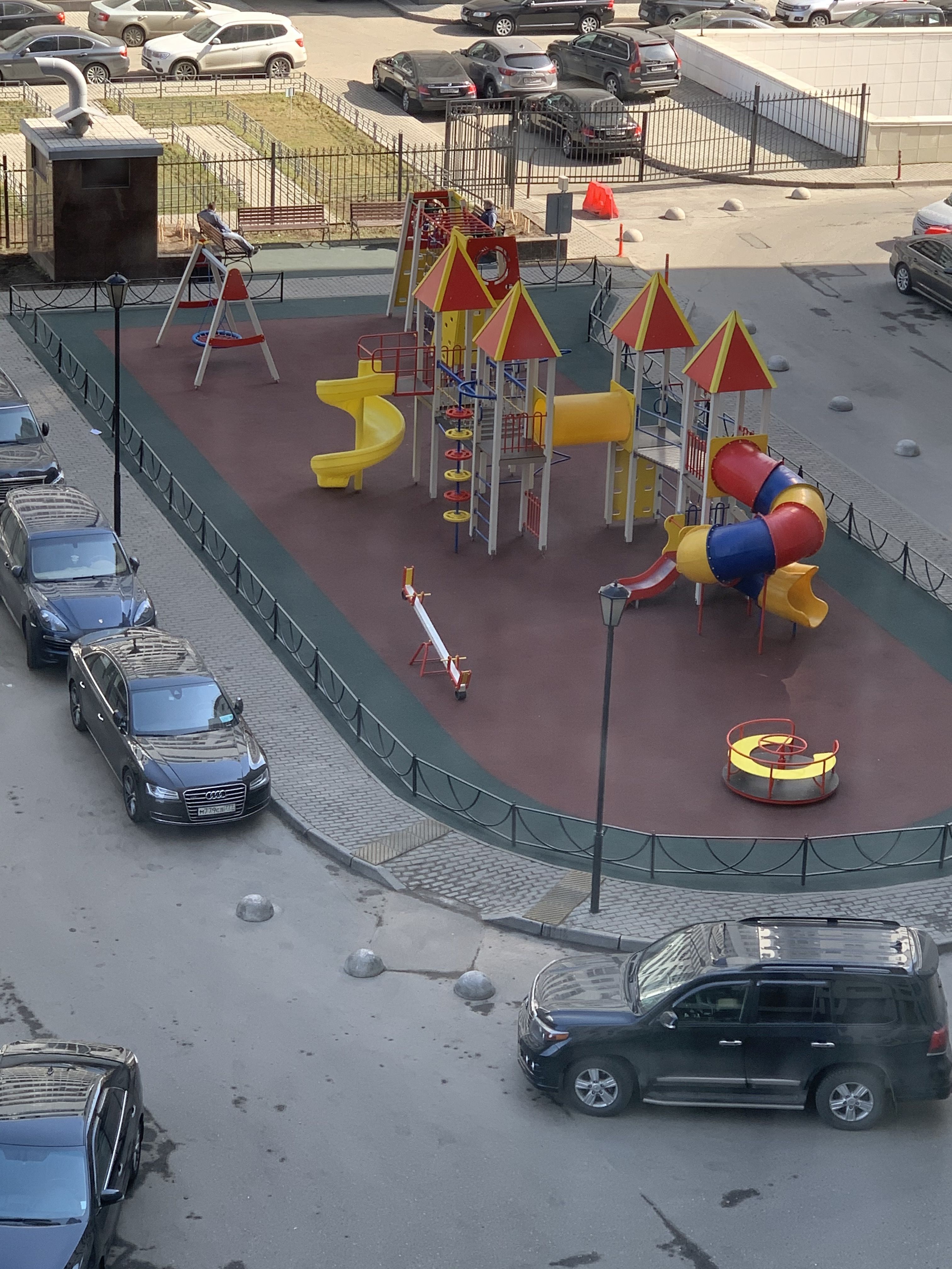 Под окном на детской площадке 19 человек - пополам дети и взрослые.