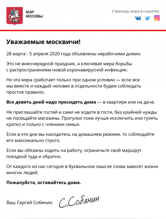 У меня большая просьба. Кто вдруг по каким-то причинам будет в каких-то общественных местах (хотя действительно - нужно оставаться дома, это все не шутки, просто правительство должно ввести карантин, а не ограничиваться просьбами, которые мало кто будет исполнять), сфотографируйте, плиз, как москвичи выполняют просьбу Сергея Семеновича, и выложите здесь в комментариях. Потому что мне вот что-то подсказывает, что москвичи (как и люди в большинстве других стран), положат на такие просьбы с большим прибором и время будет упущено.