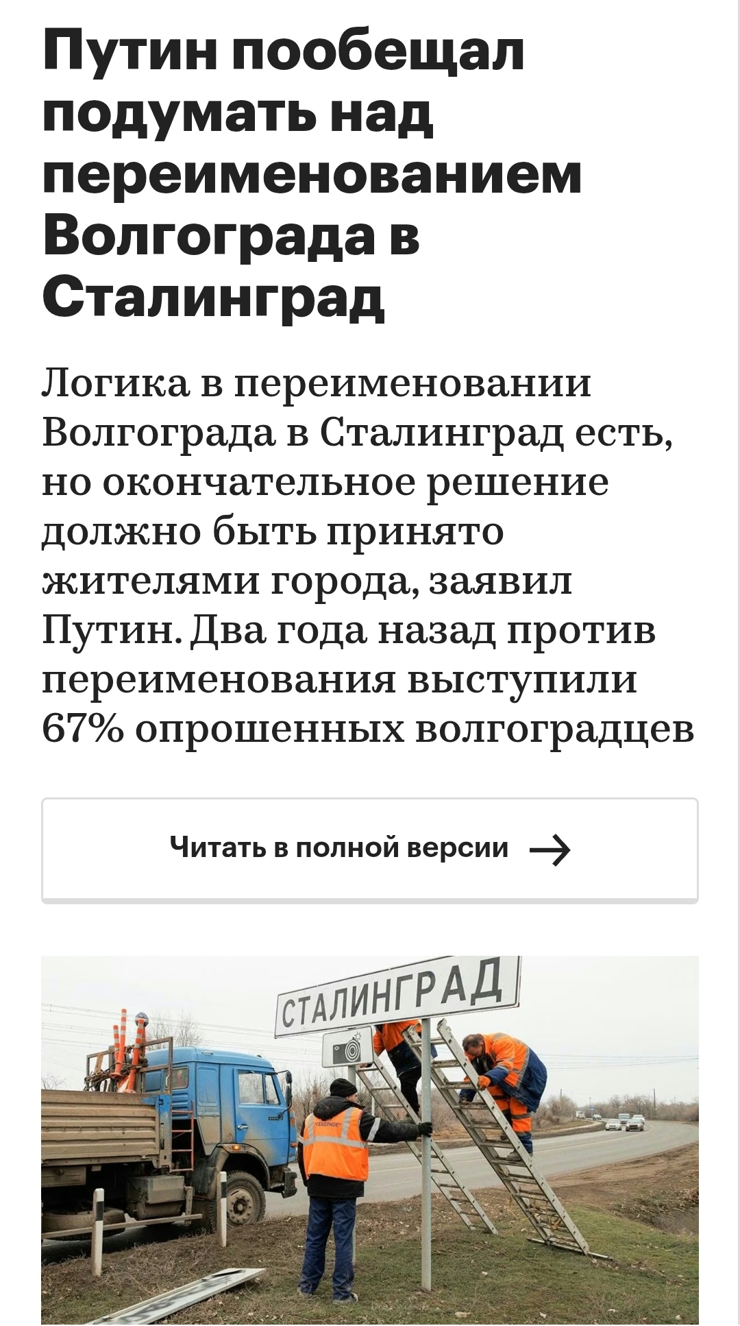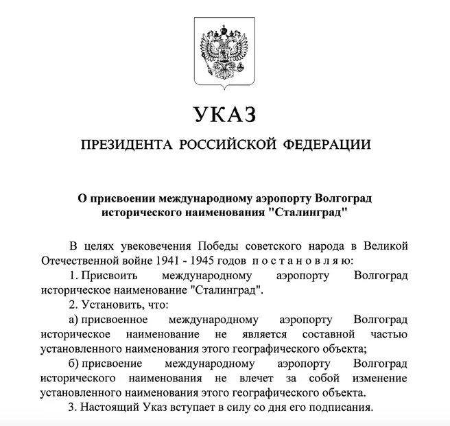 Но тут Пыня скатался в Волгоград, там ему местный губер сказал, что ему якобы поступило "много обращений" от местных жителей и жителей других регионов, среди которых были ветераны Куликовской битвы, ветераны ВОВ и ветераны сэвэо, и в ответ Пыня, дескать, заявил: "Их слово для меня — закон. Так и сделаем: как только вернусь в Москву, сразу же будет подготовлен и подписан указ о присвоении аэропорту имени Сталинграда".