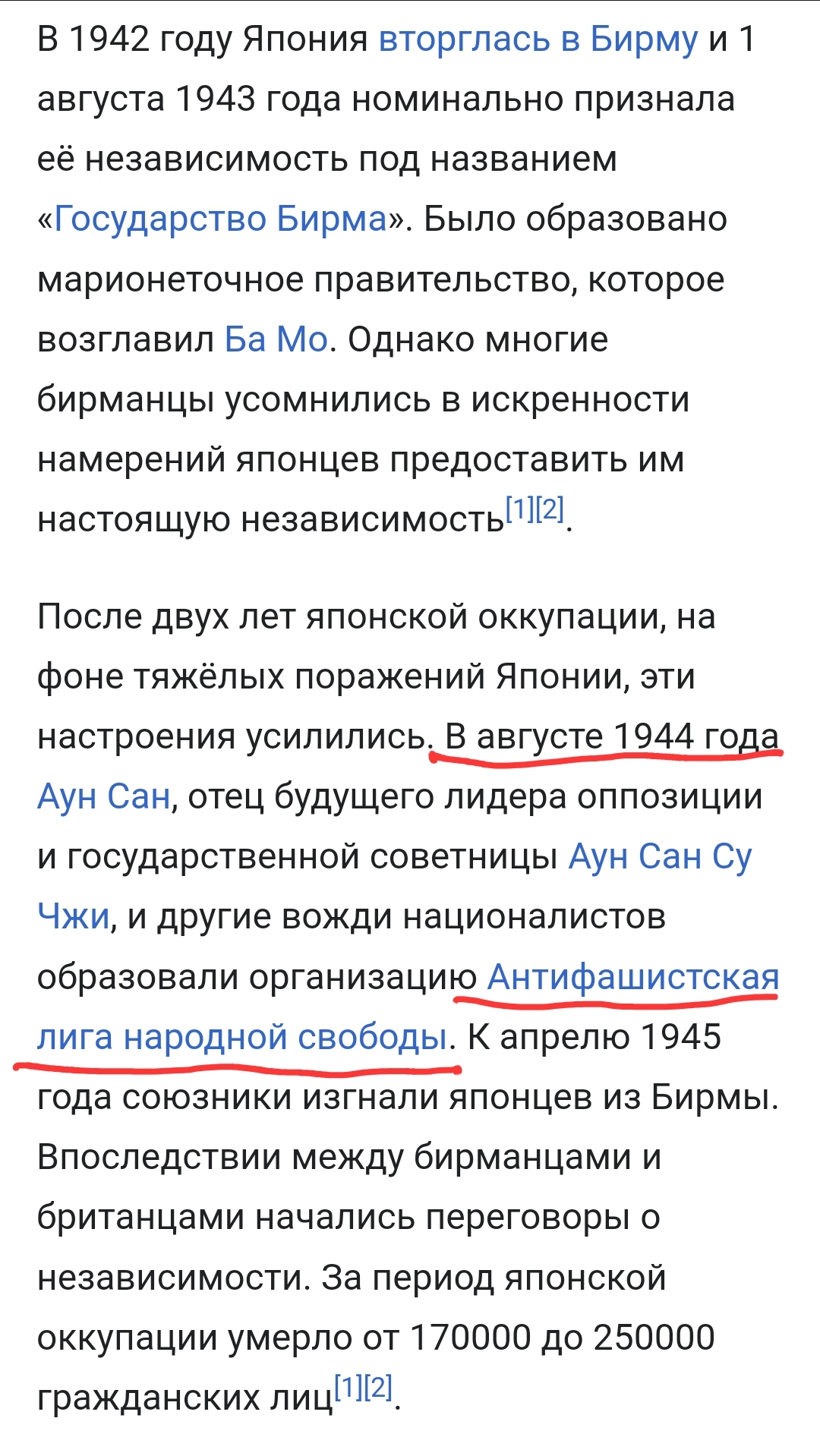 Кстати, в английской вики более подробно расписано, что сначала бирманцы воевали с японцами, а потом против.